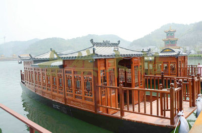 畫舫船就是裝飾古典華麗的游船,是"中國風"的仿古游船,結合古典園林建筑,體現了中華文明的古典藝術.畫舫船豪華而又古典,船上的建筑按照中國古代建筑里的亭臺樓閣,建筑工藝之復雜,要求之嚴格,仿古畫舫游船的特點飛檐翹角、玲瓏精致的四角亭子逐漸成形,赫然立于船頭,美人靠、盤龍柱子、彩畫……龍柱上的浮雕盤龍和祥云一層扣著一層,層層錯落有致,雕刻精細到盤龍身上的每一個鱗片都細細可數,古代皇家標志性元素,在畫舫船上體現的淋漓盡致。除了雕刻、花窗,整條船還有一個看點,那就是弧線優美、高高翹起的船尾。游船并不大,長約10米、寬3米,但是整體看起來堪稱一件藝術品。船尾的雕花欄桿與船艙、船頭的雕刻遙相呼應,船身四周貼著浮雕祥云,給整條船增添了富貴、華麗的氣質。